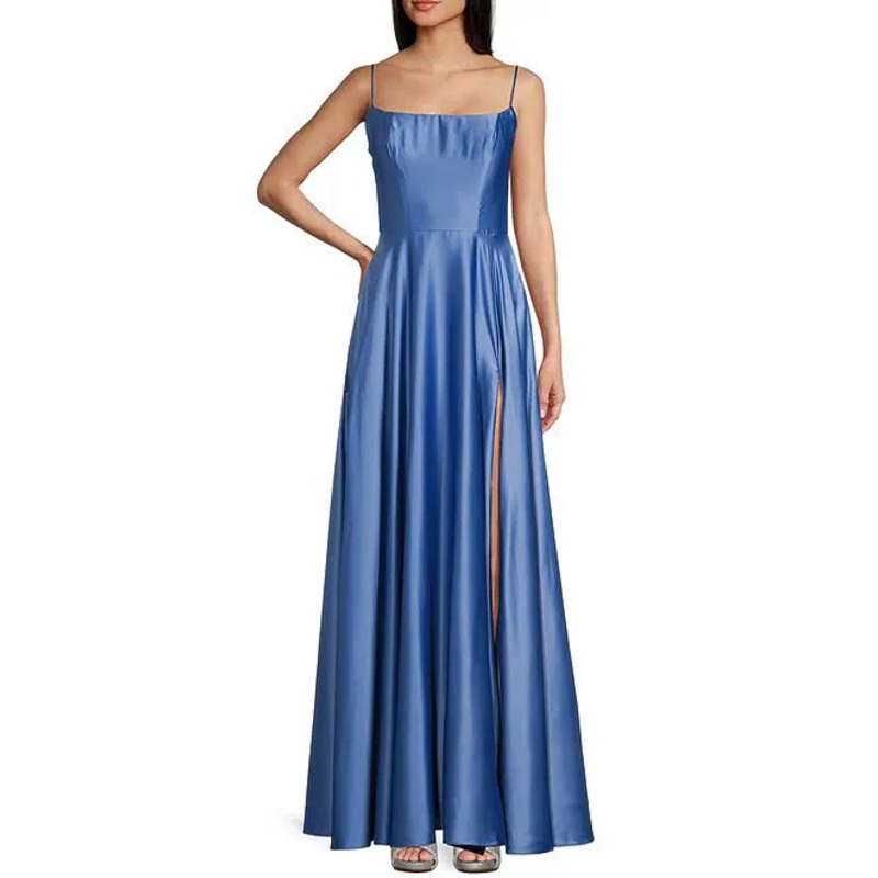 Thin shoulder strap, square neck, satin surface, satin slit, evening dress