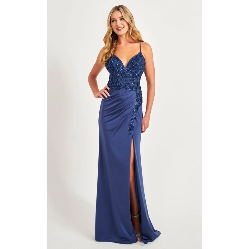 Thin shoulder strap V-neck sequined sleeveless side slit and floor length Prom dress