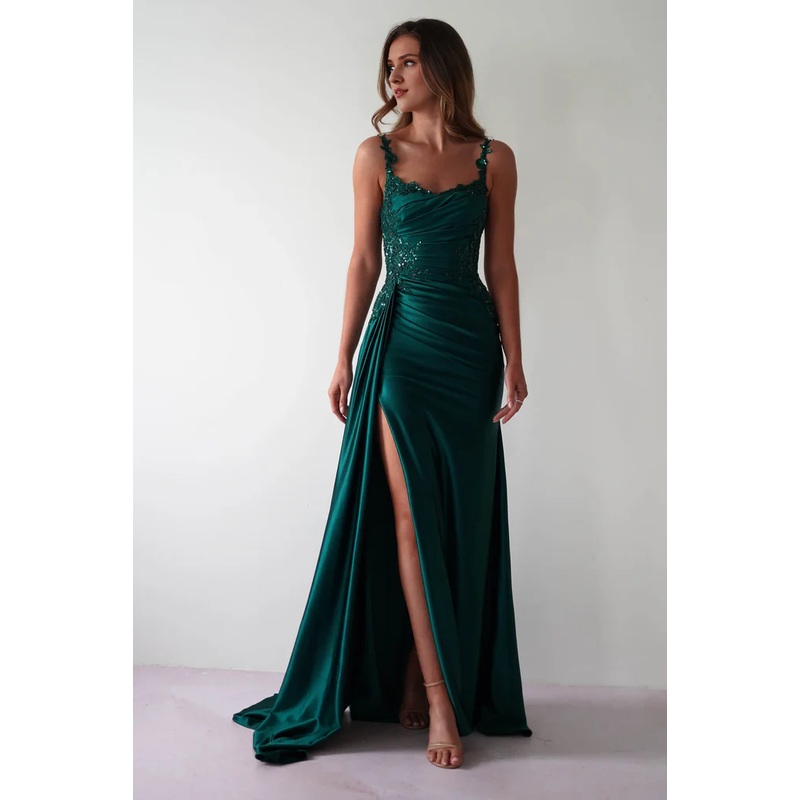 Fabric: SatinEmbellishment: Pleated, Appliques LaceSilhouette: A-lineLength: Floor-LengthNeckline: ScoopStraps & Sleeves: Spaghetti StrapsBuilt-In Bra: YesBack Style: Back ZipThin shoulder strap waistband fits snugly satin evening gowns