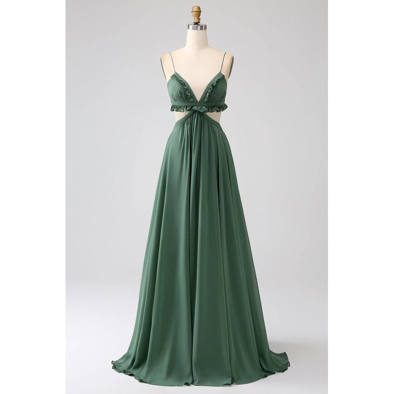 Thin shoulder strap with ruffle edge, green hollow out long bridesmaid dress