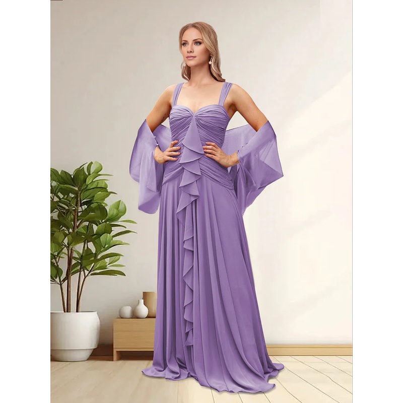 Thin shoulder strap with ruffled edges and no sleeves, formal mother of the bride dress