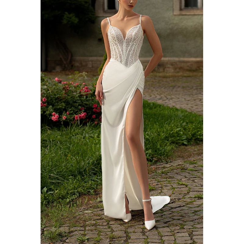 Thin shoulder V-neck satin pleated bohemian wedding dress