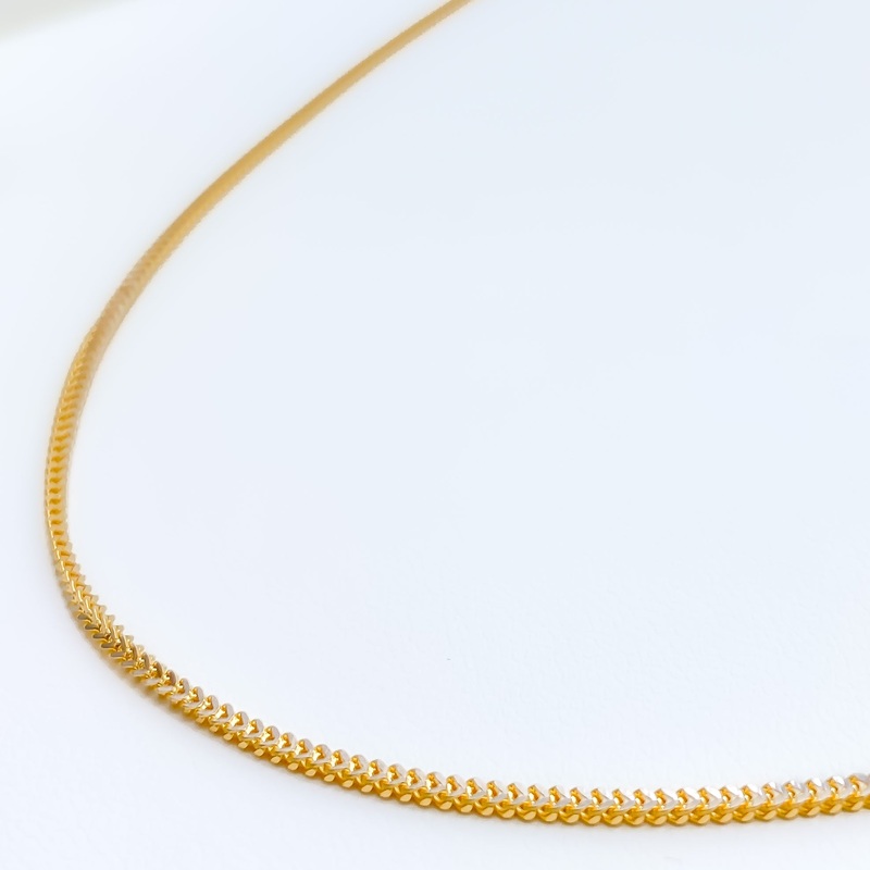 This sophisticated 22k gold fox chain, weighing 8.0 grams, beautifully combines yellow and white gold finishes. It measures 20 inches in length and 1.25 mm in width, presenting a refined and delicate design. The chain is secured with a lobster lock for added safety and convenience. Ideal for those who prefer a minimalist yet elegant accessory, this chain is a versatile addition to any jewelry collection, offering a subtle touch of two-tone elegance to both casual and formal outfits.
