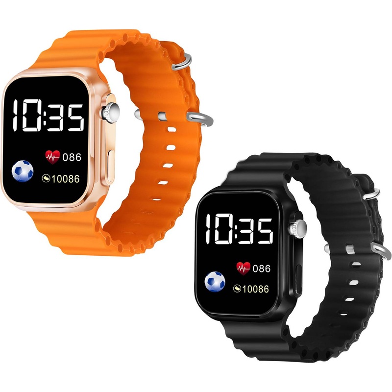 BrandTHMTDisplay TypeDigitalIdeal ForMenMechanismDigitalStyle CodeSmart Digital Led Sports Watch For Men,Women,Girls,Boys,Unisex,KidsSeriesPack of 2 Most Selling TRENDING Multicolor Ultra Square Digital watch ComboOccasionCasualMovementDigitalPack of2Sales Package2 WatchesStrap ColorOrange, BlackNet Quantity2TrendAll Black, Big Dials, Black Dial, Black Dial and Strap, Energetic Color, Water resistant, Time & Date, Sporty, Sports – Water Resistant, Sports, Premium, Pop Color, Multi Straps, Mesh StrapsWatch FeaturesDate DisplayDial ColorBlackDial ShapeSquareStrap ColorOrange, BlackWorld TimeNoDual TimeNoStrap TypeBeltStrap Material for RefinerSiliconeStrap DesignSolidPower Reserve IndicatorNoLightYesClasp TypeBuckleWarranty PeriodNAWarranty SummaryNAManufacturing, Packaging and Import InfoRead More