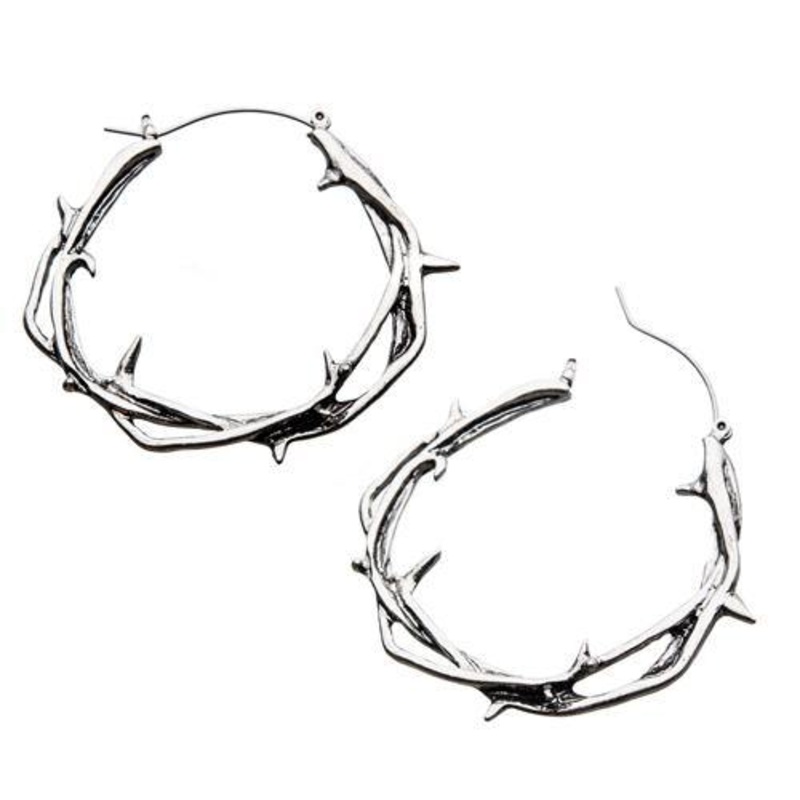 These 20 gauge thorny vine hoop earrings have a bright silver finish. These measure about 2-1/8" wide by 2" long. The hinged post is made from 316L surgical steel. They can be worn as regular earrings, but the oversize design is intended to fit comfortably