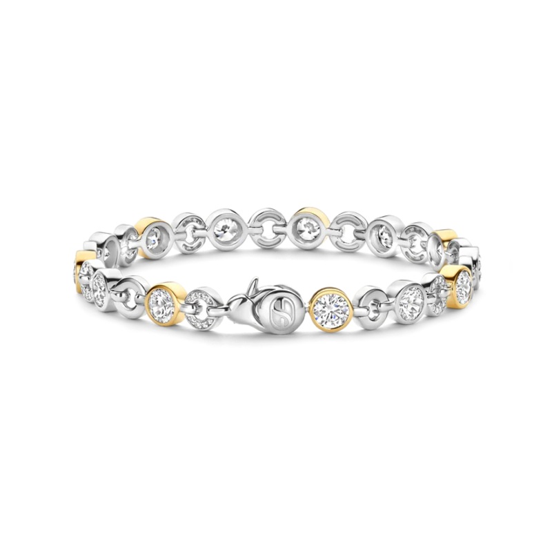 Timeless elegance meets contemporary craftsmanship in this classic TI SENTO Gold-Plated Silver Bracelet 23054ZY. Expertly crafted from premium 925 sterling silver, this piece features a stunning interplay of golden and silver hues. Bezel-set cubic zirconia