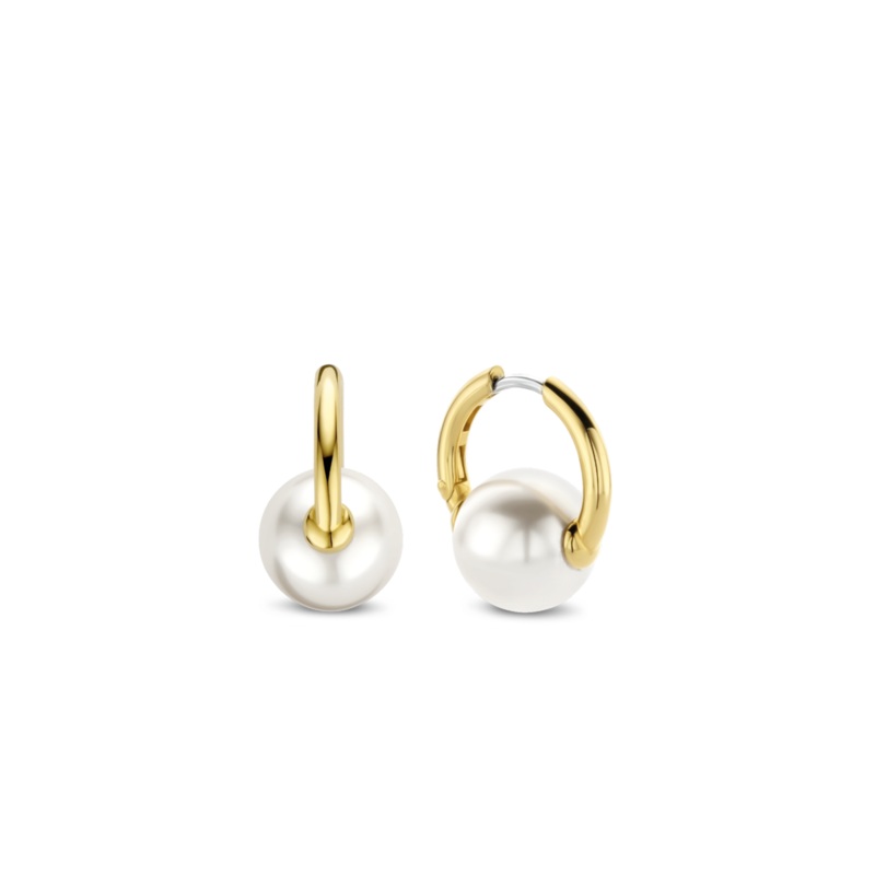 These Ti Sento gold-plated silver earrings have two white pearls held by their gold-plated settings.