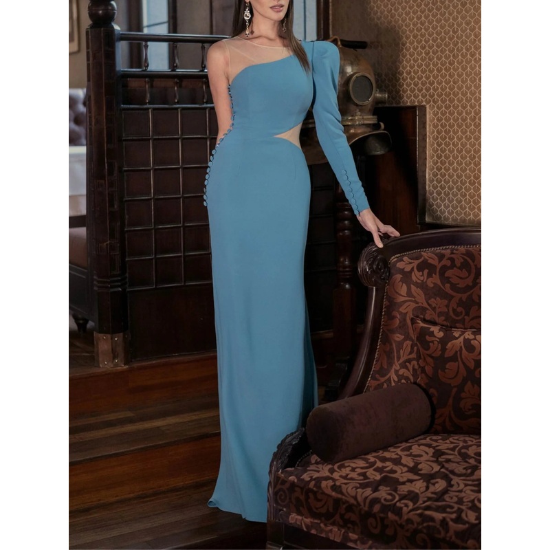 Tight fit/straight leg off shoulder long sleeved and ground evening dress