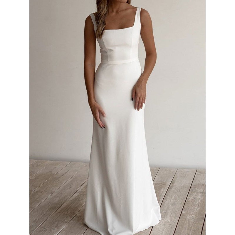 Tight fit/straight tube crepe ruffle edge shoulder strap sleeveless ground wedding dress