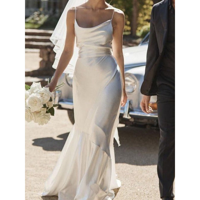 Tight fit/straight tube plain knit pleated thin shoulder strap sleeveless ground to ground wedding dress
