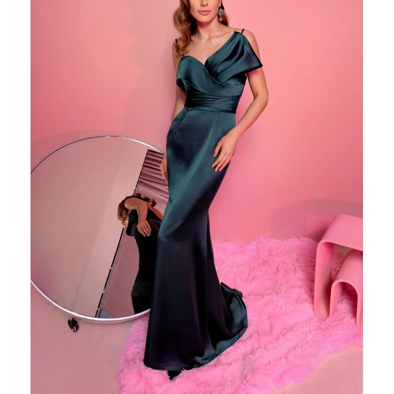 Tight fit/straight tube thin shoulder strap with ruffled edge, sleeveless and ground evening dress