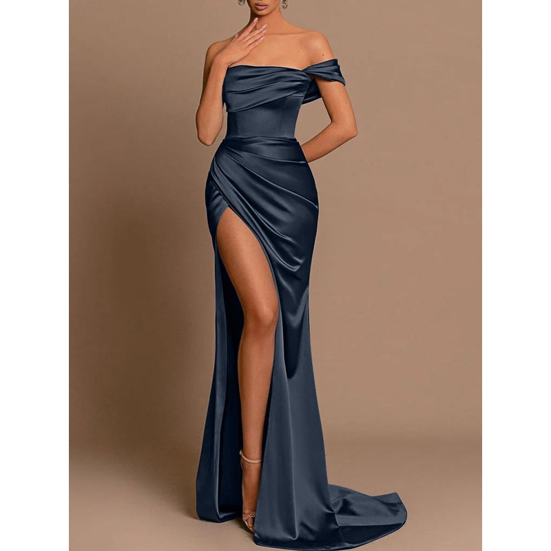 Tight fitting/straight shoulder and floor length split evening dress