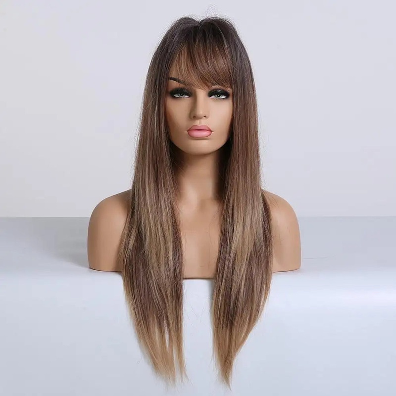 Tipped Ombre Long Straight Wig with Bangs Heat Resistant High Density Long Synthetic WigDensity: 130%Cap Size: Average SizeTexture: StraightMaterial Grade: High Temperature FiberWigs Length: Long