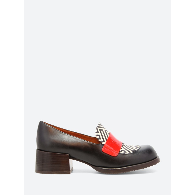 Chie Mihara loafer-inspired pump with a colour-block finish, sitting on a stacked block heel.