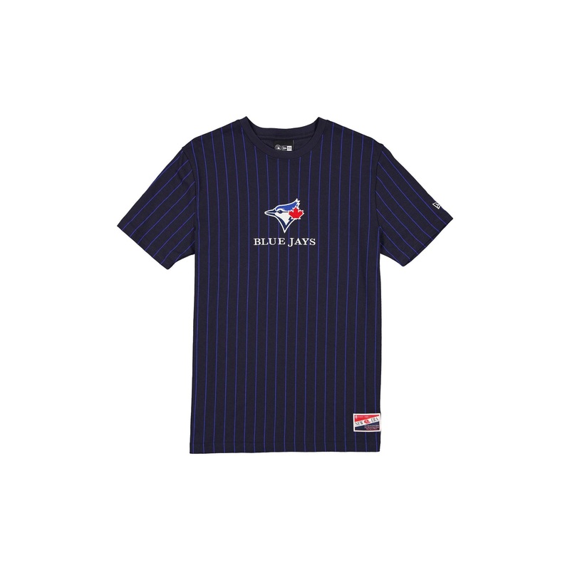 The Toronto Blue Jays Throwback Pinstripe T-Shirt features an embroidered Blue Jays logo and wordmark at the front with a New Era jock tag at the left hip.