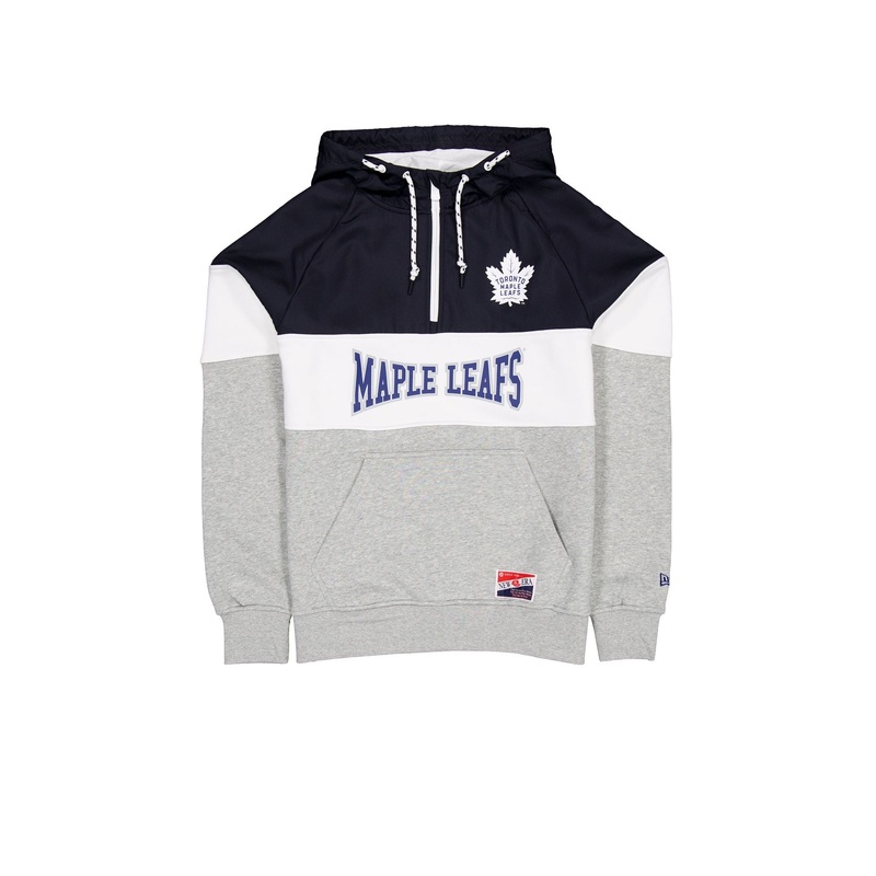 The Toronto Maple Leafs Throwback Color Block Hoodie features a screen-printed Maple Leafs logo and team wordmark at the front with a quarter zip closure at the collar.