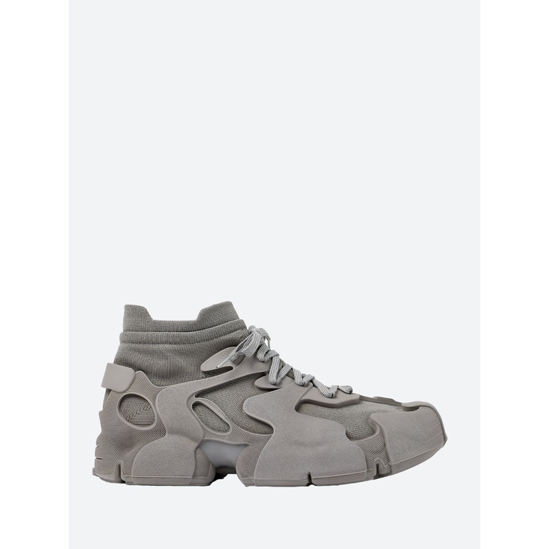 CamperLAB caged sneakers with water repellent 3D-knitted PET sock interiors, direct injection TPU exteriors, and recycled PU outsoles. Fully recyclable.