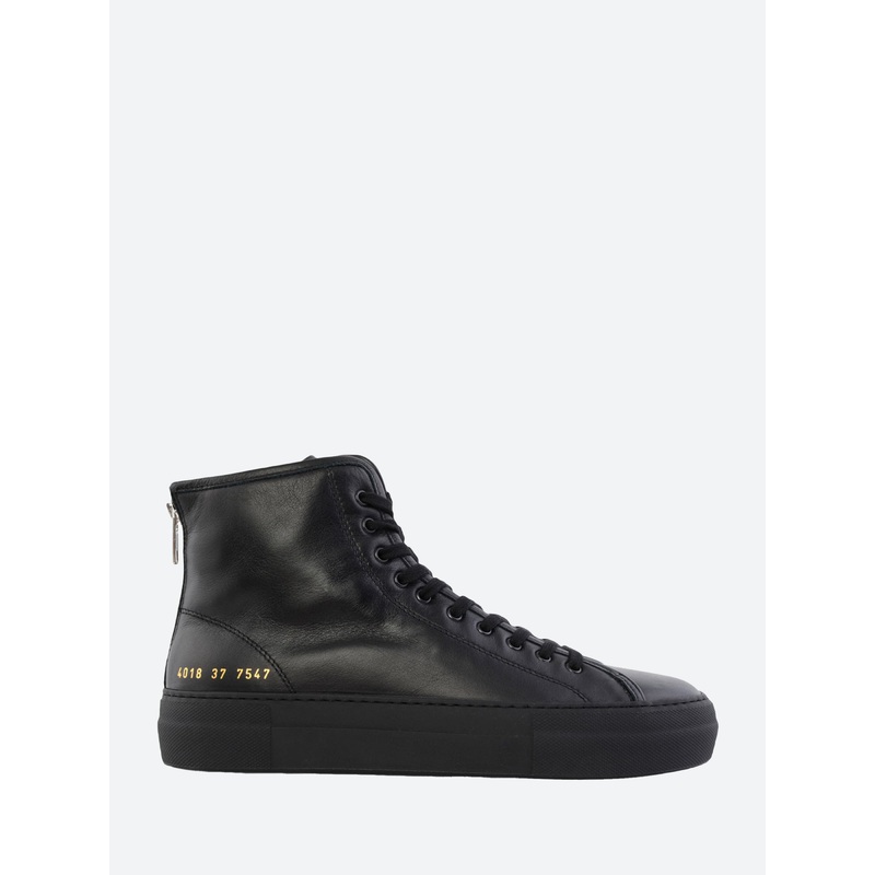 Woman by Common Projects Tournament High takes cues from some of the most iconic sport footwear. Constructed from suede and leather lined. Features tonal stitching and finished with their signature gold-stamped serial number. Classic high top sneaker in Italian craftsmanship.