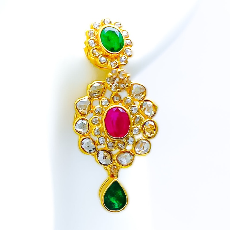 These exquisite 22k gold vintage earrings, weighing a total of 7.7 grams with a gold net weight of 6.9 grams, feature a traditional floral design adorned with uncut diamonds (Polki) and vibrant stones. The yellow gold finish enhances their timeless appeal, making them perfect for special occasions. The uncut diamonds, totaling 1.82 carats, come in irregular oval and round shapes, adding unique sparkle. Complementing the diamonds are rubies and emeralds, weighing 2.17 carats and shaped in irregular ovals and pear drops, adding a touch of color and elegance. With a length of 1.25 inches and a hanging style, these earrings offer a sophisticated and comfortable fit, secured with screw-back posts. Ideal for those who appreciate high-quality craftsmanship and classic beauty, these floral vintage earrings are a cherished addition to any jewelry collection.