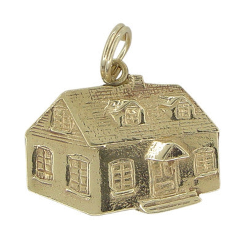 This vintage house charm, circa 1950’s, is a 3d house in minature! Crafted with fine detail, this 14K solid gold house pendant measures 7/8 inch wide by 9/16 inch wide.