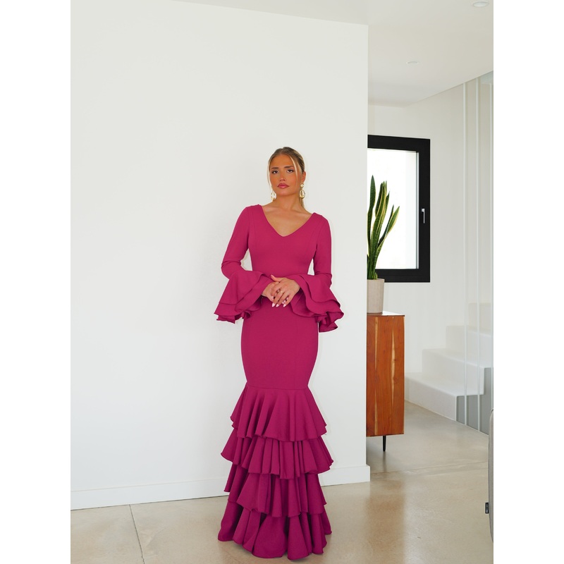 Traje de flamenca ajustado con escote pico. Tiene manga larga y campana, cremallera trasera y volantes. El vestido es elstico y se adapta al cuerpo.