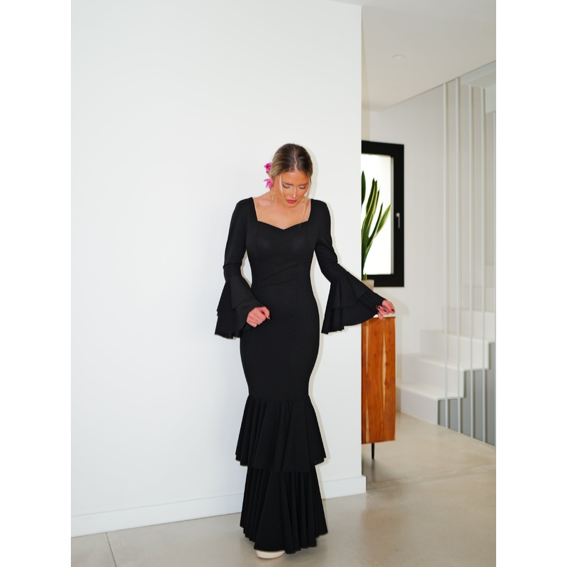 Traje de flamenca ajustado. De manga larga y campana, escote pico, cremallera trasera y volantes. El vestido es elstico y se adapta al cuerpo.
