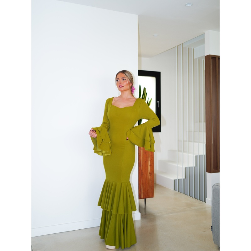 Traje flamenca volantes escote pico oliva S (34-36)