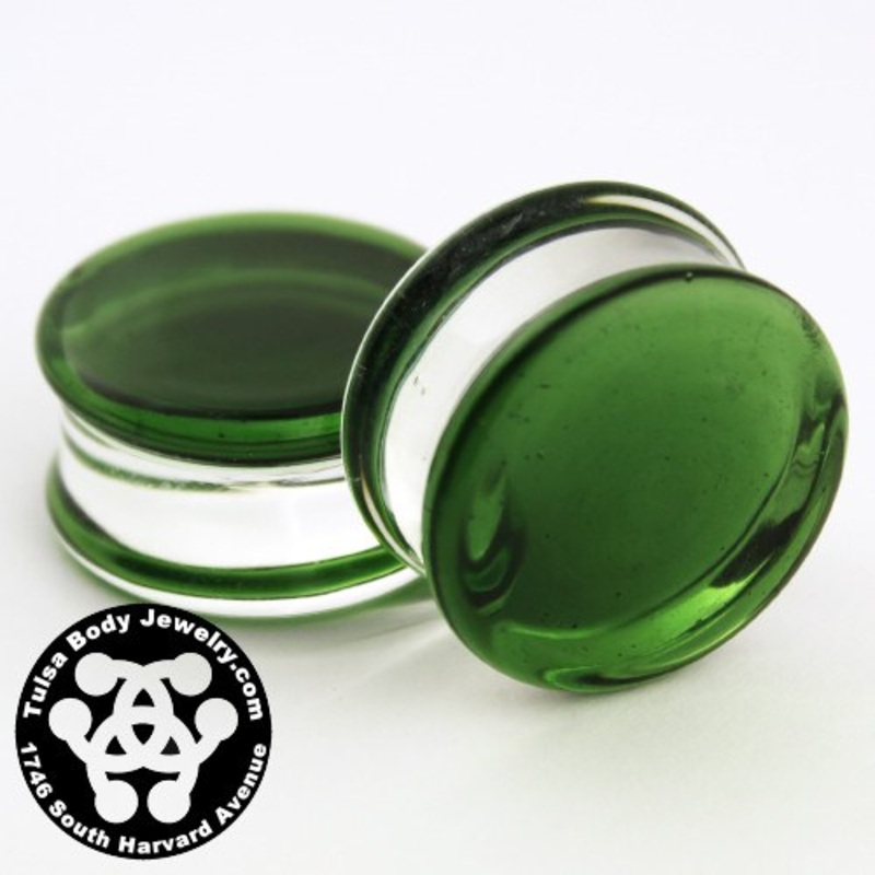 These double flare translucent greencolor front plugs aremade from hand blown borosilicate glass by Glasswear Studios. They have a wearable area of approximately 3/8" between flares. Choose your size below.