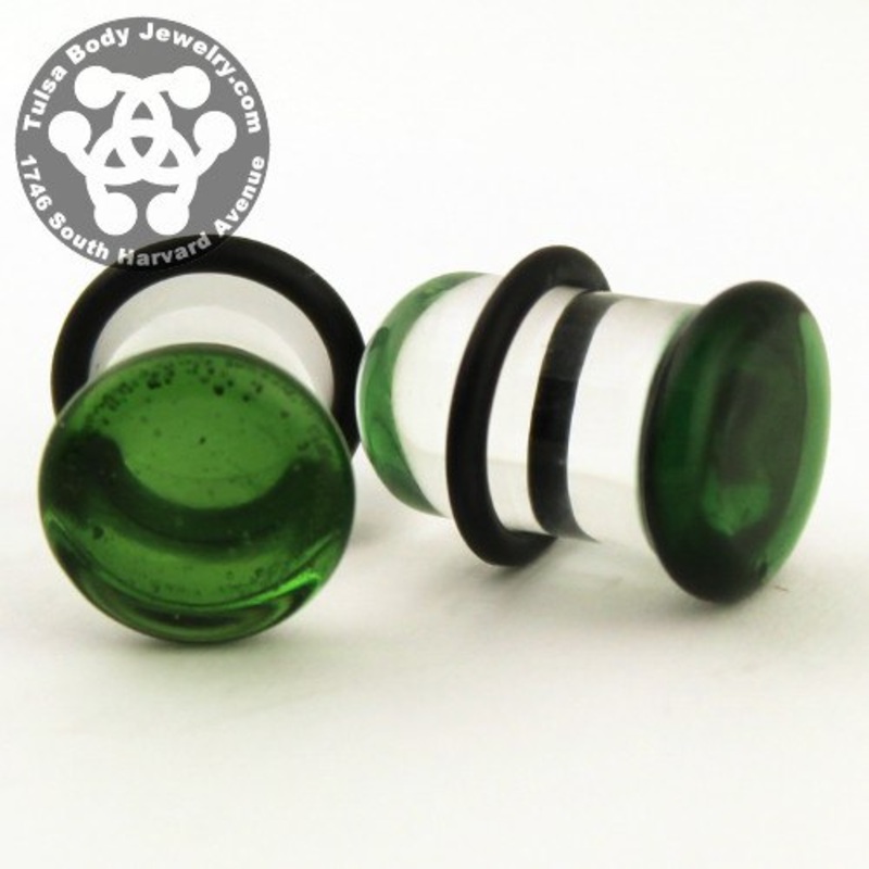 These single flare translucent greencolor front plugs aremade from hand blown borosilicate glass by Glasswear Studios.They have approximately 3/8" wearable area between the flare and o-ring. Two o-rings are included. Choose your size below.