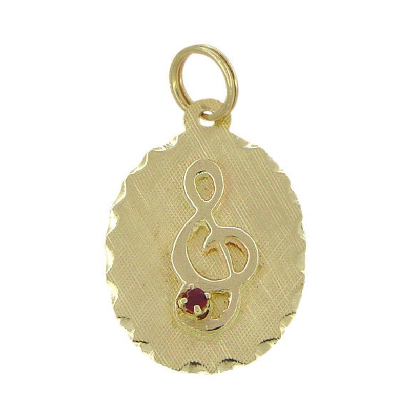This vintage treble clef medallion charm in 14K yellow gold dates from the 1960’s, and has a red gemstone set at the end of the clef. A perfect musician’s charm, it measures 5/8 inch wide by 7/8 inch high.