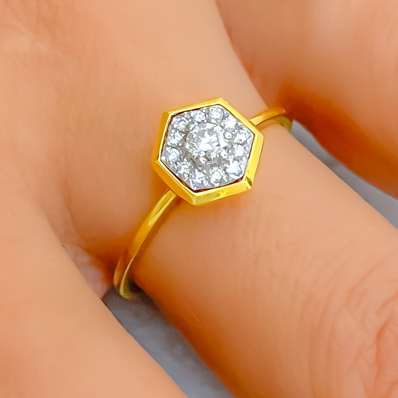 This 18k gold ring features a trendy hexagon design, beautifully accented with 0.17ct of round brilliant cut diamonds. Weighing 1.9 grams, the ring showcases a polished yellow gold finish and is available in a size 7, with sizing options. The diamonds, with F-G color and VS quality, add a touch of sparkle that perfectly complements the modern hexagon shape. Ideal for those who appreciate contemporary style with a luxurious twist, this ring is a chic and versatile piece for any occasion.