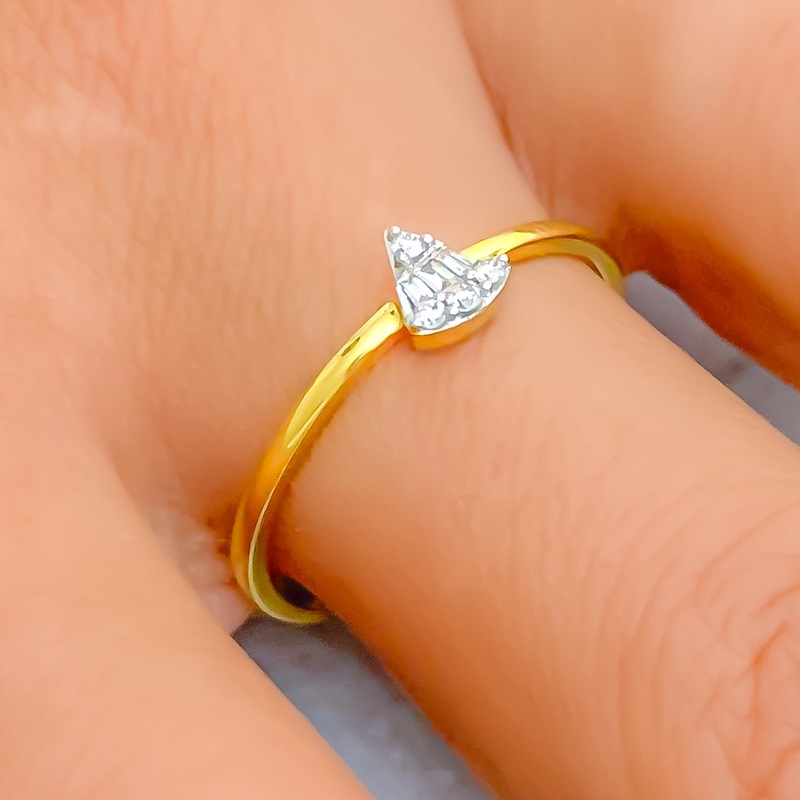 Step into contemporary elegance with the Trendy Triangular ring, a chic accessory crafted from 18k yellow gold. Weighing 1.2 grams, its design embodies modern sophistication. Adorned with round and baguette-cut diamonds totaling 0.06 carats, arranged in a trendy triangular motif. Graded G-H color and VS clarity, these diamonds ensure exceptional sparkle. With a size of 8.25 and resizing options available, it offers a perfect fit for any occasion. Elevate your style with this trendy ring, ideal for making a fashion-forward statement.