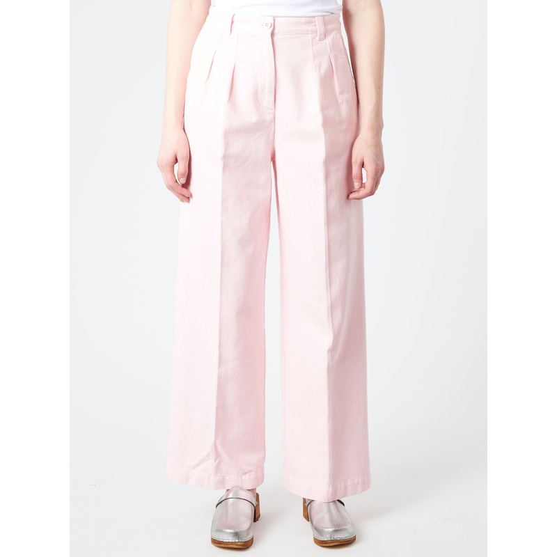 Organic and recycled denim pleated pants with a high-rise, loose-fit chino spirit. Featuring permanent creases on the front and back, the design has a wide leg silhouette for a polished look.