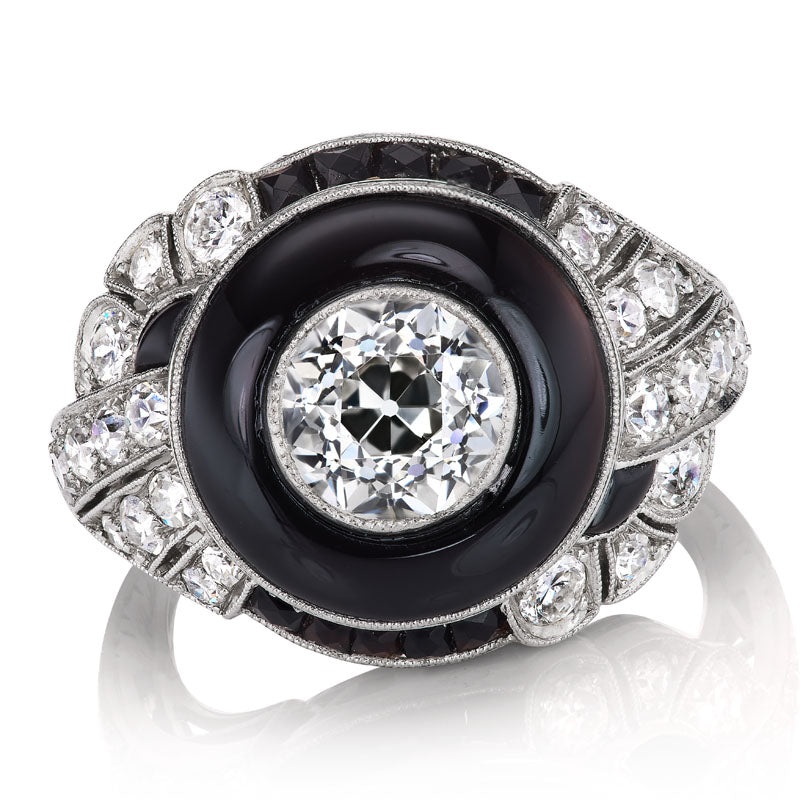 TheTrevisoring is an authentic vintage diamond ring from the Art Deco Era circa 1920. The ring centers a GIA-certified 1.13-carat oldEuropean cut diamond ofJ color,SI1 clarity. The stone is bezel set in a platinumsetting with a gorgeous black enamel halo surrounding the center stone. Ten French-cut onyx baguettes and 22 old cut diamonds are set throughout thesetting of the ring to give abold contrast of colors. The ring is currently size4.5 and can be resized!