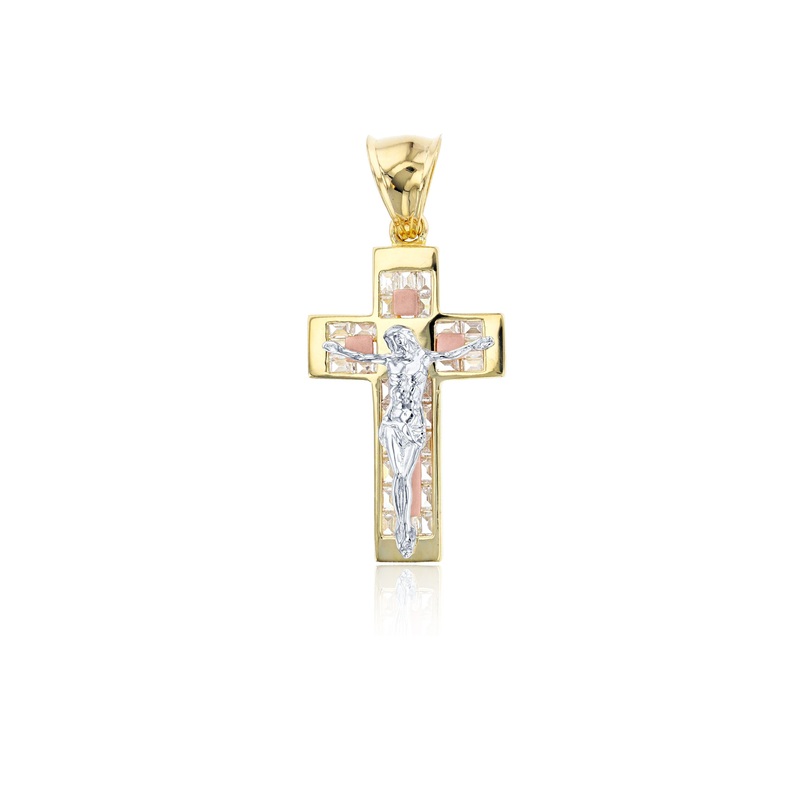 Tricolor Pave Baguette Cut Crucifix Cross Pendant (14K)
