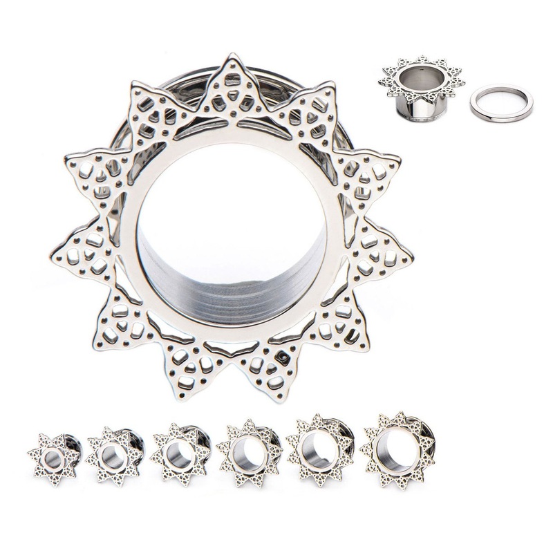 These screw-on triptych tunnels are made from 316Lsurgicalgrade stainless steel with external threading.They have a wearable area of 1/4" between flares. The back side unscrewsfor easy insertion. Choose your size below.