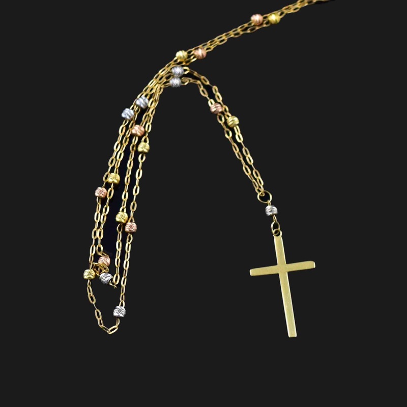 This exquisite tritone cross charm necklace, crafted in 14 karat yellow gold, features a variety of rope engraved gold beads in yellow, rose, and white gold. The stunning chain leads to a solid gold cross, making it a truly exceptional gift for any special