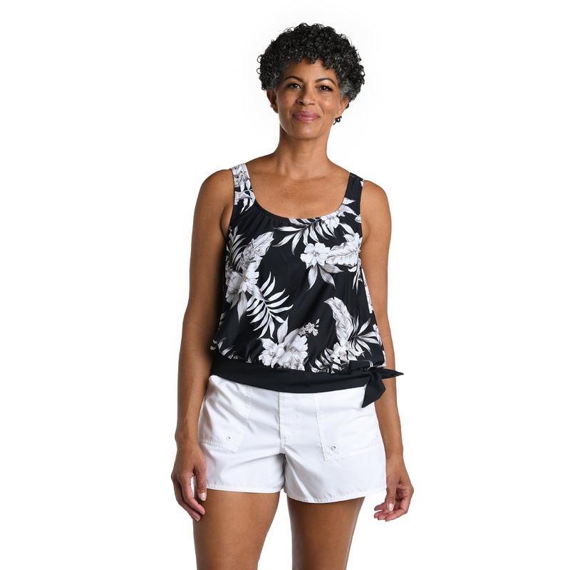 Free ship on orders $79 and up!Elevate your swimwear with thistop adorned in a captivating black and white tropical print, transporting you to exotic shores with its chic and timeless design. The loose-fitting blouson style masks the tummy area, while the