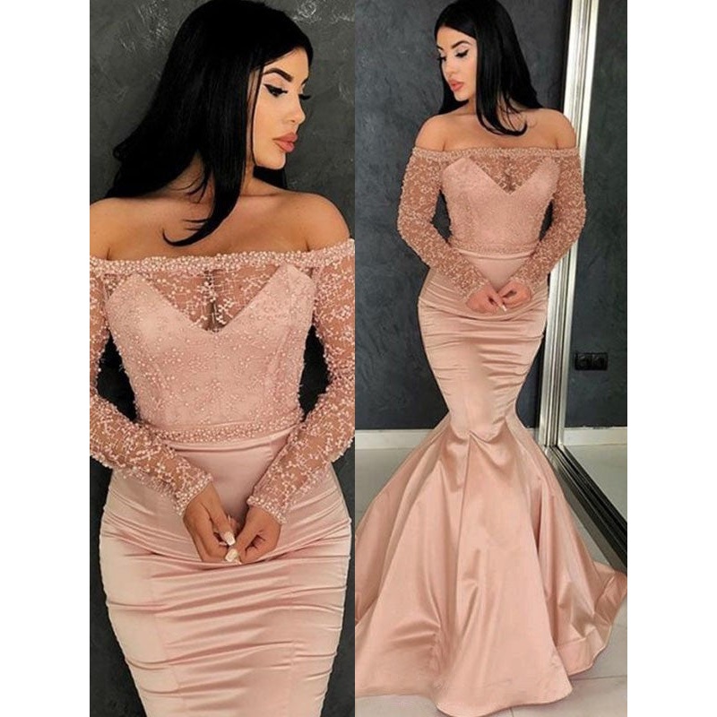 Trumpet/Mermaid Long Sleeves Off-the-Shoulder Sweep/Brush Train Ruffles Satin Dresses