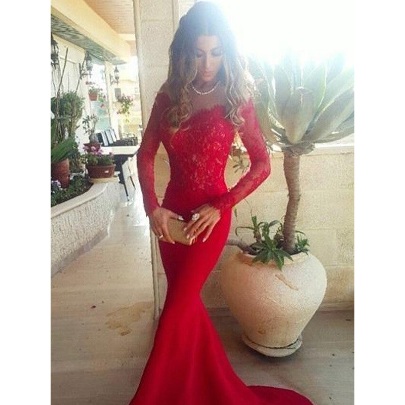 Trumpet/Mermaid Off-the-Shoulder Long Sleeves Lace Sweep/Brush Train Woven Satin Dresses