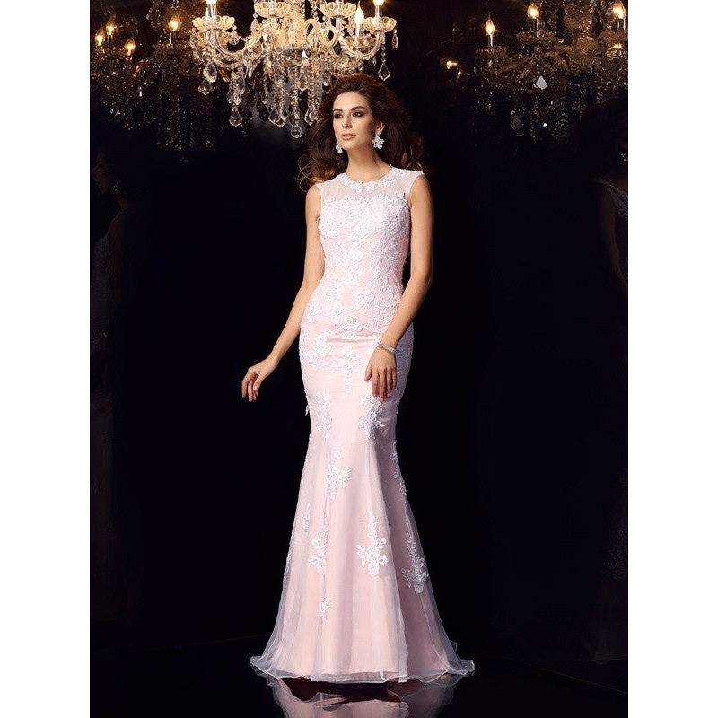 Trumpet/Mermaid Scoop Lace Sleeveless Long Satin Sweep/Brush Train Dresses