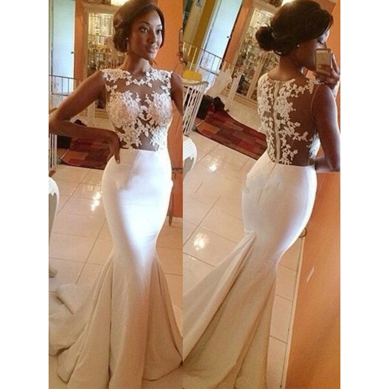 Trumpet/Mermaid Scoop Sleeveless Sweep/Brush Train Lace Crepe Wedding Dresses