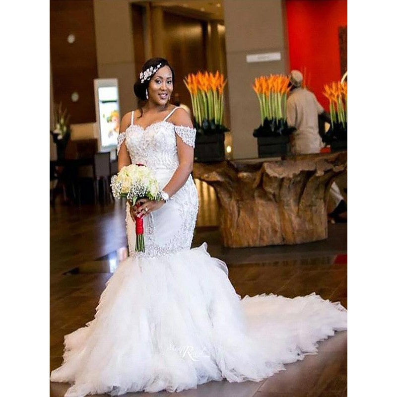 Trumpet/Mermaid Sleeveless Off-the-Shoulder Court Train Beading Tulle Wedding Dresses