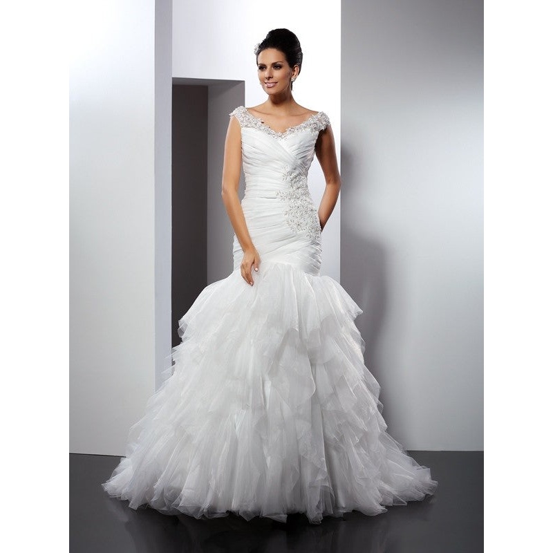 Trumpet/Mermaid V-neck Applique Sleeveless Long Tulle Wedding Dresses