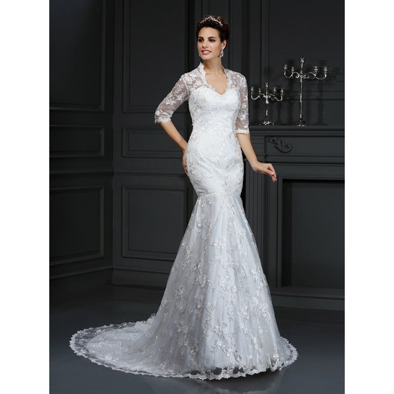 Trumpet/Mermaid V-neck Lace 1/2 Sleeves Long Lace Wedding Dresses
