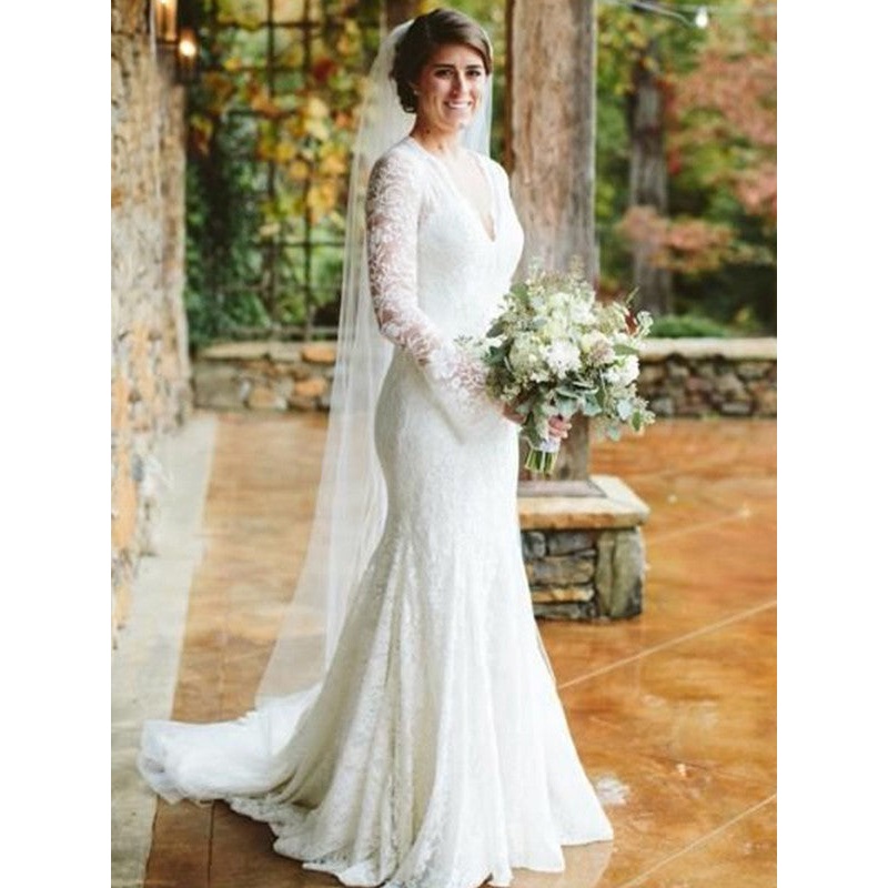 Trumpet/Mermaid V-neck Long Sleeves Sweep/Brush Train Ruffles Lace Wedding Dresses