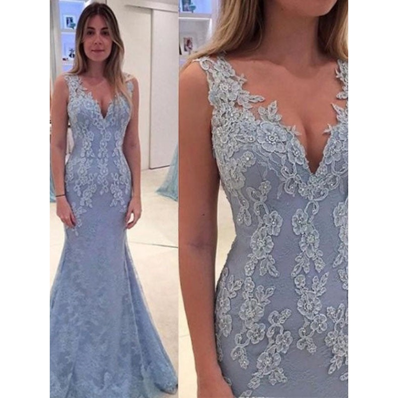 Trumpet/Mermaid V-neck Sleeveless Applique Sweep/Brush Train Lace Dresses