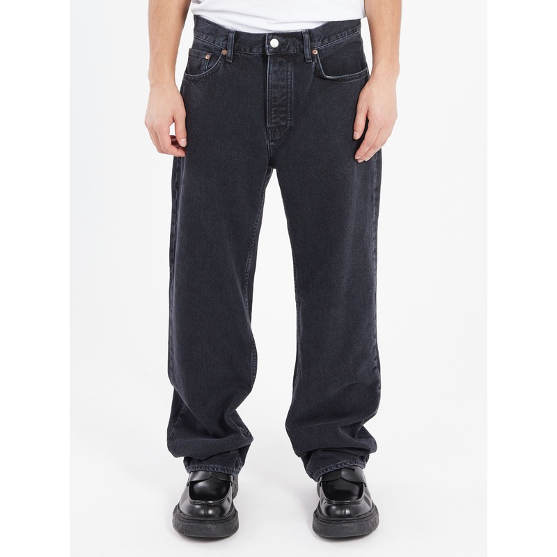 Wide-legged loose-fit jeans in a vintage-like cold-cast black wash with rich marbling texture and subtle bluish highlights. Made from organic cotton.High waistButton closure with button flyFive pocket styleJacron patchCopper trimsBlack thread at seamsWide