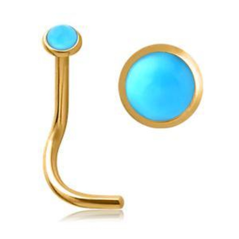 The nostril screw is made from gold PVD coated 316L stainless steel. The 2.35mm bezel-set gemstone is available in turquoise only. Choose your size below.