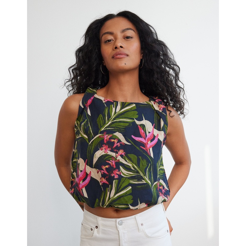 a summer staple fit for every closet. crafted from a lightweight blend of linen and cotton, this bubble top features a clean neckline with twisted shoulders for a touch of volume. the not-quite-cropped length makes this top effortless to style.